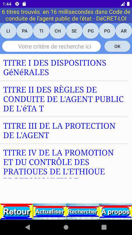 Het ingevoerde criterium is gemakkelijk terug te vinden in de verschillende niveaus (boek (LI), deel (PA), titel (TI), hoofdstuk (CH), sectie (SE), alinea (PG), punt (PO), artikel (AR) en inhoud (OK)) van de publicatie.