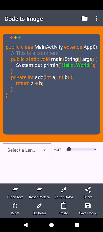 Ontgrendel de kracht van prachtig ontworpen codefragmenten met Code to Image, een gestroomlijnde mobiele applicatie die de geliefde functionaliteit van Carbon binnen handbereik brengt. Of u nu een ontwikkelaar, blogger of docent bent, met deze app kunt u uw code met slechts een paar tikken omzetten in deelbare afbeeldingen van hoge kwaliteit.