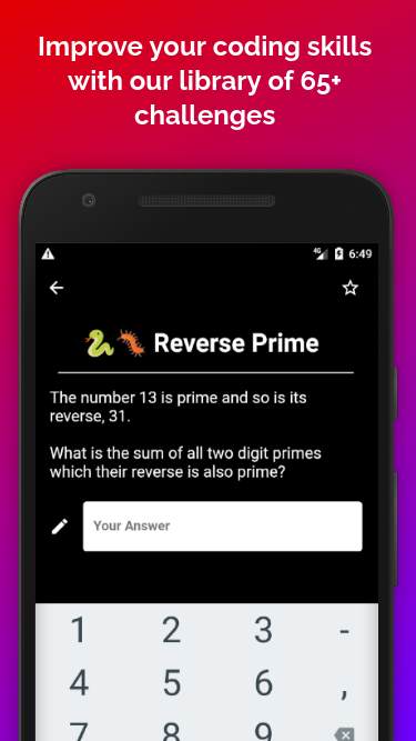 📚 The challenges involve writing a small program to figure out the solution to a clever mathematical formula, equation or algorithmic challenge. 👨🏻💻 This app is perfect for anyone who wants to keep their problem solving and programming abilities on the cutting edge. 🖊📖