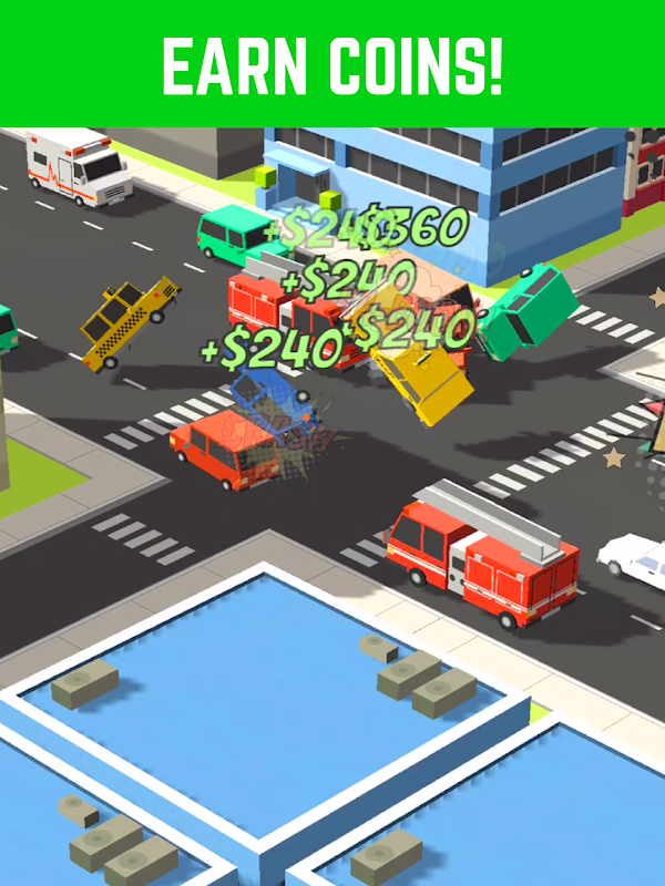 Crash into the other cars to earn in game cash. In Collide Forever you can use the money you earn to upgrade your car and earnings, the bigger the crash the better the payout.