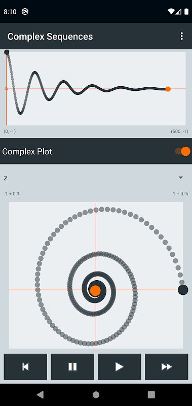 Echte en complexe plots geven visuele feedback terwijl u door een reeks loopt. De echte plot kan Re (z), Im (z), Mod (z), Arg (z), Re (sum), Im (sum), Mod (sum) of Arg (sum) weergeven. In de complexe plot kunnen sequentiewaarden of gedeeltelijke sommen worden weergegeven. U kunt de plotmodi op elk willekeurig punt in een reeks wijzigen, zodat u duidelijk kunt zien hoe de waarden in de loop van de tijd veranderen. De grafieken maken deze applicatie een waardevol hulpmiddel voor het begrijpen van het lange-termijngedrag van sequenties en reeksen.