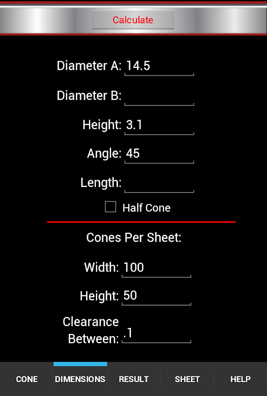 Voer de gewenste afmetingen van de afgewerkte kegelvorm. U hoeft slechts één diameter en twee andere van de vijf mogelijke afmetingen van de laatste kegel voeren. De andere dimensies wordt berekend uit deze.