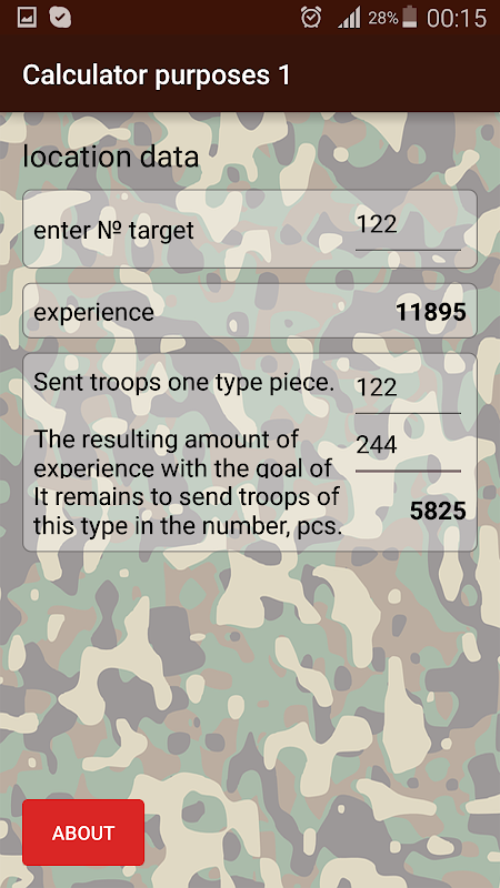 Приложение будет незаменимым помощником в прохождении локаций игры Конфликт и получении на них приза. Дополнительно можно рассчитать количество оставшихся войск, как по целям, так и у противника (на острове, тайнике, хранилище ,оккупации, излучателе) без использования разведки (атака боем).
