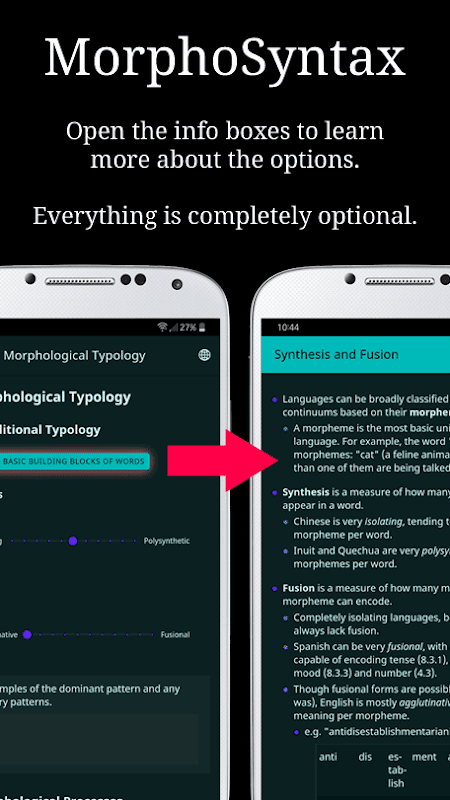 MorphoSyntax: een overzichtsgids voor het opzetten van de algemene morfologie en syntaxis van een conlang. Plan de manier waarop woorden, zinsdelen en zinnen worden gevormd. Maak een overzicht en exporteer het naar een tekstdocument.