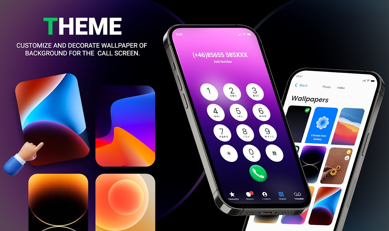 Pas de vooraf gedefinieerde achtergrond van de achtergrond voor het oproepscherm aan en versier deze met onze app iCallScreen - ios Phone Dialer. Als je iets anders wilt of een afbeelding uit de galerij wilt kiezen, kun je elegante achtergronden en achtergronden vinden in de app-instellingen