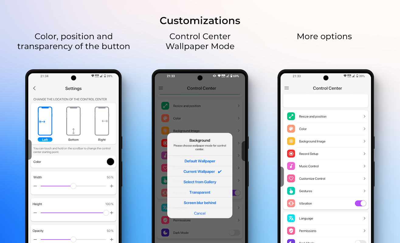 Control Center Simple 17 Style: het is een controlecentrum voor Android met stijl, gericht op het verbeteren van de bruikbaarheid van uw telefoon, biedt de meest gebruikte toegangen, maar met een stijl en gemakkelijker te gebruiken, wees productiever en sneller met het Simple Control Center met stijl, verhoog of verlaag het volume, regel de helderheid verticaal en met één hand!