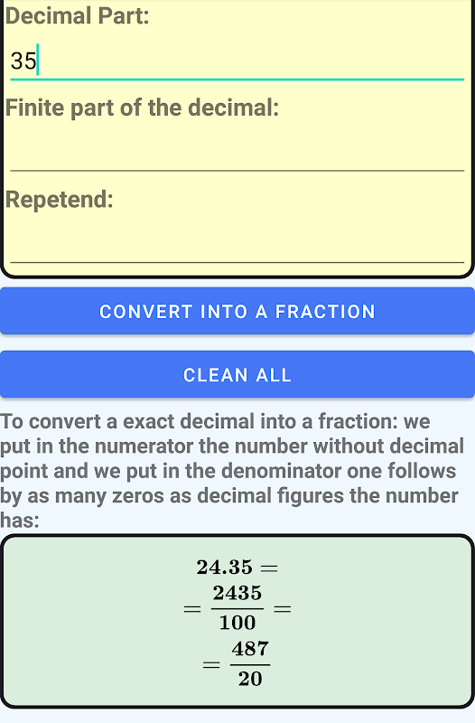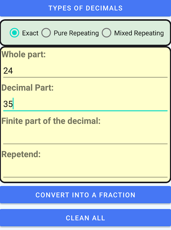 This application converts a decimal number into its equivalent fraction. The decimal numbers that can be converted into fractions are: the exact decimals, the pure repeating decimals and the mixed repeating decimals.