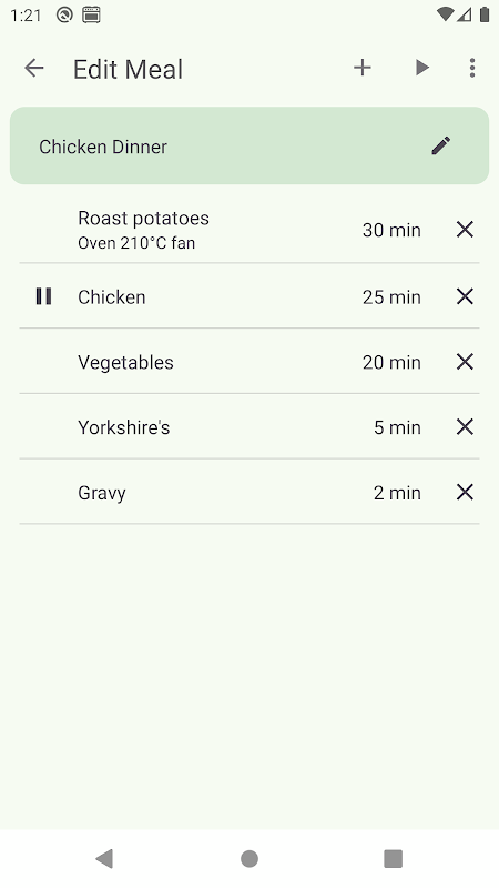 Creëer eenvoudig een maaltijd door voor elke kookstap de individuele kooktijd toe te voegen, en eventueel een start na (uitstel) en een eind vóór (rust)tijd in te stellen.