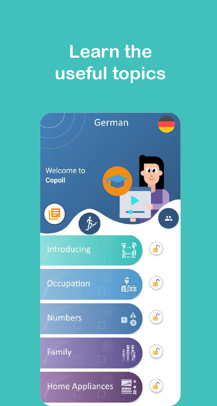 Copoll is gebouwd om een omgeving voor te bereiden waarin gebruikers nieuwe talen kunnen leren. Dit is de eerste versie van deze app en gebruikers kunnen tot nu toe de Duitse taal leren, maar het zal in de nabije toekomst Engels, Frans, Turks, Farsi en dergelijke omvatten. De gebruikers kunnen deze talen tot dusver in het Engels en Farsi leren en in toekomstige updates zullen gebruikers uit meer talen kunnen leren.