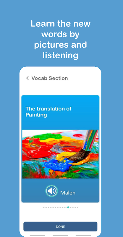 Gebruikers kunnen woordenschat leren door afbeeldingen te observeren en naar hun uitspraken te luisteren, wat een van de beste methoden is om nieuwe woorden te leren en te onthouden. Er is ook het grammaticagedeelte met gegevens voor leerlingen om te leren hoe ze de geleerde woorden kunnen gebruiken. Een ander deel van de app is het oefengedeelte waarmee leerlingen kunnen oefenen wat ze hebben bestudeerd in het gedeelte woordenschat en grammatica.