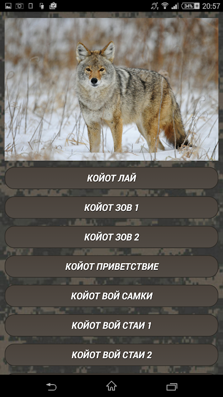 Coyote-programma voor jachtoproepen verandert uw mobiele telefoon in een jacht op roofdieren. Voor het beste effect kan worden aangesloten op een externe actieve luidspreker.