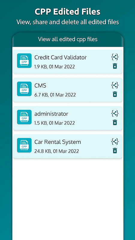 Cpp Reader is een gebruiksvriendelijke en eenvoudige editor voor CPP-bestanden (C++ Programming Language). Met Cpp Reader kunt u eenvoudig alle CPP-bestanden bekijken, CPP-code eenvoudig naar het klembord kopiëren, code delen op alle sociale media, 50+ editorthema's en meer.