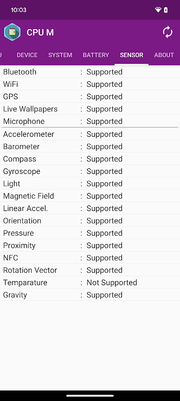 CPU-M is een applicatie die verschillende informatie over het apparaat geeft, zoals CPU, systeem, batterij, sensor en meer.