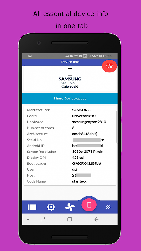 Houd de CPU-/batterijstatus van uw apparaat in de gaten en verkrijg alle specificaties van het apparaat.