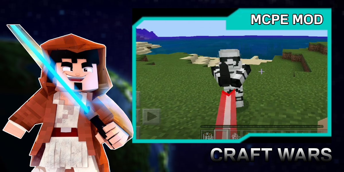 Crafting wars mod voegt een echte intergalactische sfeer toe aan je spel! Star Wars-fans zullen er dol op zijn. In deze mod vind je veel helden uit het universum die je in Minecraft PE aan je kaart kunt toevoegen. Kies aan welke kant u zich bevindt in craft var. Vecht tegen de duistere Sith Lord Darth Vader en zijn keizerlijke stormtroopers! Voeg Captain Han Solo, Skywalker, Legendary Jedi Knight Obi Wan en de Great Green Grand Master toe aan je team. Vecht met unieke skins en wapens. Maak een lichtzwaard en harnas. Ontvang speciale bonussen en items van mobs en maak legendes over jou in het Minecraft-universum met deze buitenaardse mod. Een opvallende toevoeging aan het spel zal galactisch transport zijn: gevechtsvliegtuigen, raketten, ruimteschepen, drones en unieke robots in de vorm van dieren! Bel je vrienden, doe mee aan de strijd als een echte Jedi tegen de Sith en creëer je eigen ruimteplaneet in Minecraft MCPE.