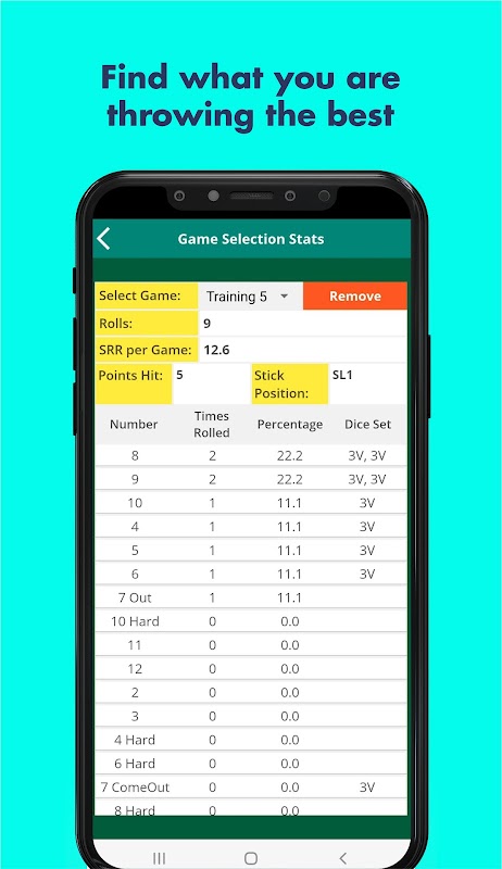 De Craps Dice Tracker-app houdt je bij, geeft je SRR (Sevens to Rolls Ratio) en geeft je statistieken voor elk van je games. In het Casino en Training.