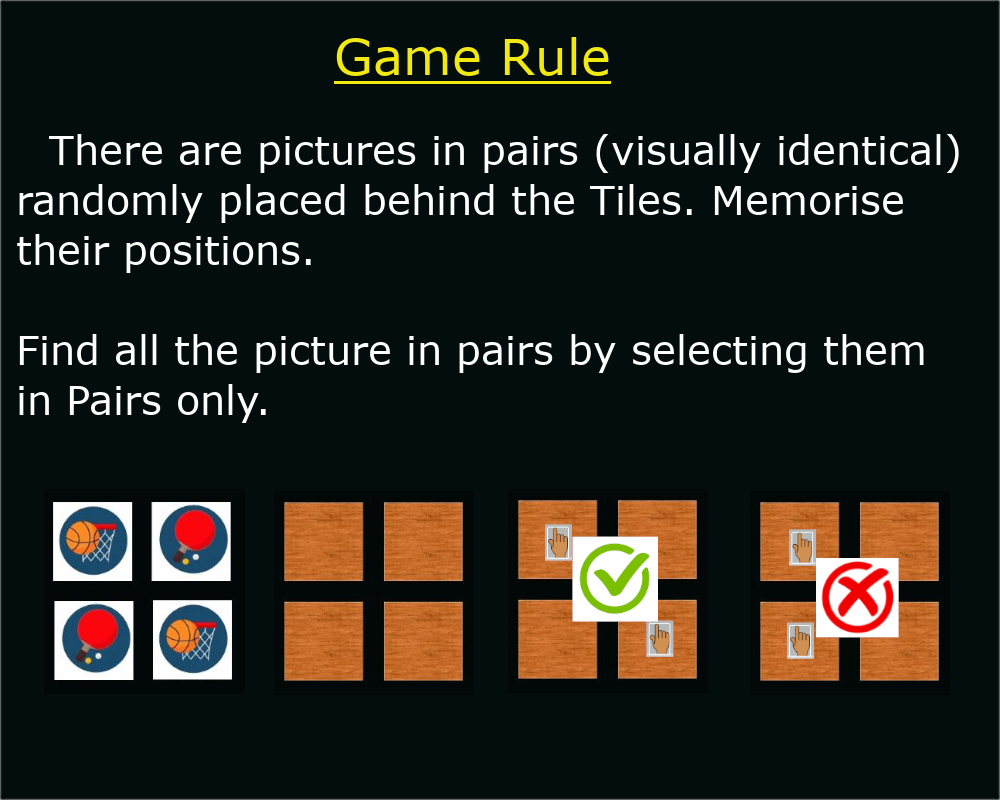 Als speler kiest om te spelen, zullen foto's op tegels te zien, elk heeft zijn paar, een paar seconden. Dan is de tegel zal worden teruggedraaid. Selecteer nu de tegel. Het beeld verborgen achter de tegel zal worden getoond. Selecteer nu de tweede tegel. Als het beeld achter de eerste en tweede selectie past dan is het de Pair anders zal het terug again.But worden gedraaid nu speler weet en herinneringen welk beeld waren achter de tegels. Probeer met andere tegels. Blijf proberen totdat u alle foto paren in het spel te vinden.
