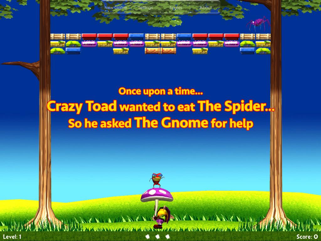 Een breakout stijl spel met een leuke twist. In Crazy Toad bestuur je een oude kabouter die bezig is met een grote paddestoel, en je doel is om gelijke tred te houden met de stuiterende pad, niet laten vallen op de grond.