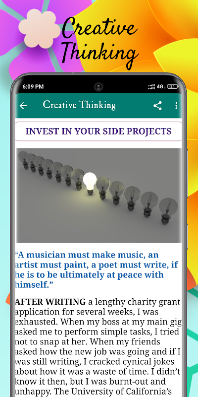 Creatief denken: tips en strategieën voor innovatie is de ultieme app om je creativiteit te stimuleren en je creatieve denkvaardigheden te verbeteren. Of je nu je innerlijke artiest wilt ontketenen, je creativiteit een boost wilt geven of gewoon innovatiever wilt worden in je denken, onze app heeft iets voor jou. Met 'Creatief denken' leer je praktische tips en strategieën voor creatieve visualisatie, brainstormen en divergerend denken, evenals technieken om je creatieve geest te voeden en de kracht van creatieve verbeeldingskracht te benutten. Je leert ook over verschillende soorten creativiteit, creatieve persoonlijkheidskenmerken en het creatieve proces, en hoe je deze concepten kunt toepassen op je leven en werk. Dus als je klaar bent om je creativiteit naar een hoger niveau te tillen, download dan vandaag nog Creative Thinking en begin je creatieve denkvaardigheden een boost te geven!