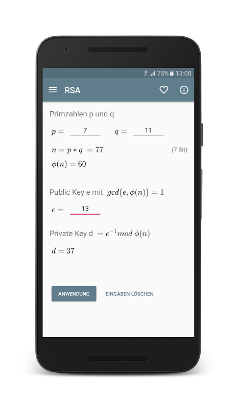 - Mathematische Funktionen: Primzahltest (Fermat, Miller Rabin), Eulersche Phi-Funktion, GGT (Euklid) & Multiplikatives Inverse