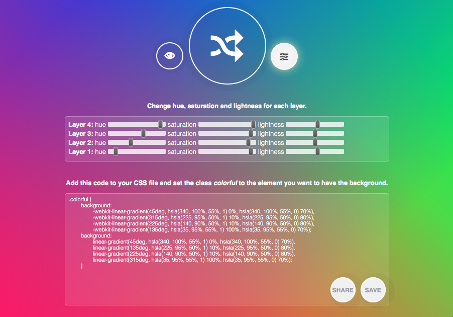 Genereer, bewaar of deel de css-code voor stijlvolle kleurovergangen die kunnen worden toegepast op uw webtoepassingen of uw HTML5-websjabloon. U kunt de gradiënten krijgen met behulp van de middelste knop om willekeurig de css-code te genereren, maar ook via een handige en krachtige tool voor het regelen van de intensiteit en kleur hsl. Om de code te genereren, klikt u eenvoudig op de knop gemarkeerd met een pictogram gemarkeerd in één oog.