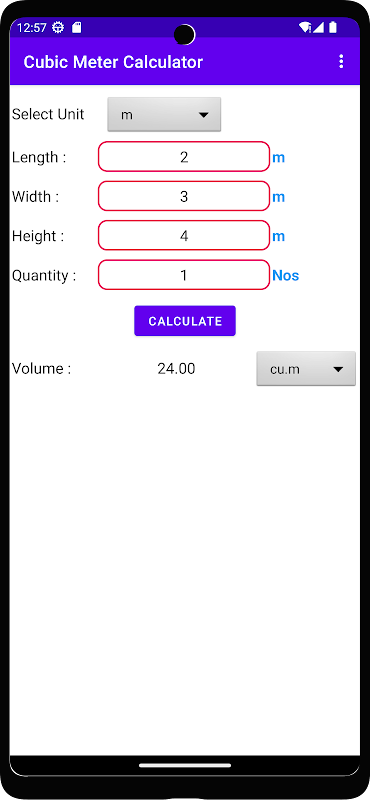 Deze app wordt gebruikt om het kubieke metervolume te berekenen voor een bepaalde lengte, breedte en hoogte. U kunt lengte, breedte en hoogte invoeren in verschillende eenheden, zoals meter, voet, inch, mm, cm, yard enz. Het antwoord krijgt u in kubieke meter, kubieke voet, kubieke yard, enz.