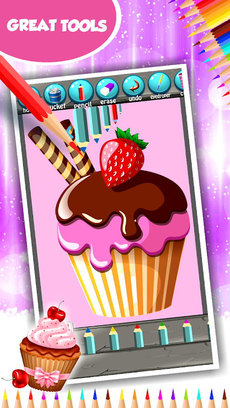 Veel plezier terwijl u door de collectie van de coolste schetsen bladert die uw favoriete dessert presenteert. Download gratis de nieuwste Cupcake Coloring Book app en laat de foto's volledig verrukken. Kijk eens naar die prachtige slagroom met glanzende kers, dat is jouw favoriete fruit dat de zoetste cake met boog verfraait. Wees niet verward wanneer water op je mond loopt, maar tik op de verfbak en maak de meest sensationele foto die de wereld ooit heeft gezien zodra je het klaar bent. Het zal je telefoon prachtig verfraaien en je kan je ogen niet van je scherm afnemen. Breng de mooiste namiddag in de leemten van de heerlijke chocolade en aardbei. Ze bedeck het spectaculaire dessert klaar om te worden geserveerd, je hoeft alleen maar de schets ervan te schilderen en het wordt compleet. Krijg de nieuwste cupcake kleurapplicatie op je tablet en geniet van de illustraties van de sensationele banketbakkerij.