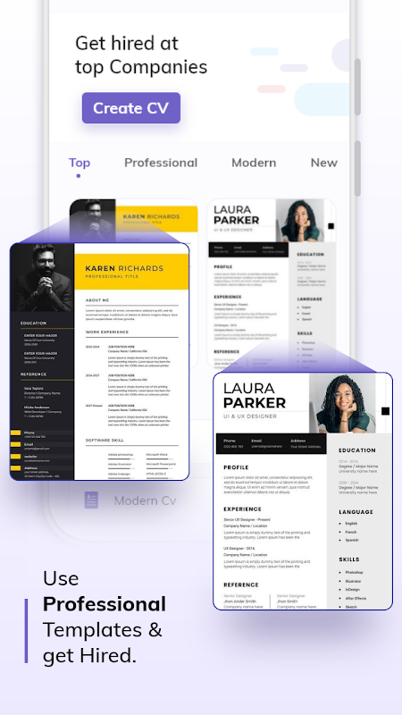 Bovendien helpt de app voor het maken van cv's je bij het maken van cv's voor verschillende banen. Het biedt een reeks cv- en cv-sjablonen voor verschillende banen. Daarom is de app CV maker het beste hulpmiddel voor werkzoekenden om de weg naar een vaste carrière te vinden.