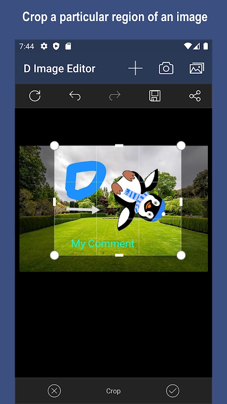 - Fotobewerker biedt een optie om een bepaald gebied van een afbeelding naar wens bij te snijden met behulp van het ingebouwde bijsnijdgereedschap.