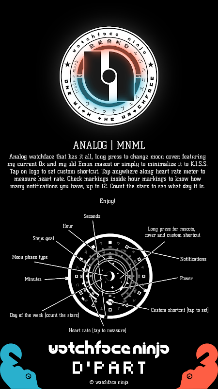 Eenvoudige analoge wijzerplaat, het is een vertrek met diepgaande kunst. Watchface biedt alles wat je nodig hebt: tijd, hartslag, stappendoel, vermogen, dagen, maantype, aangepaste snelkoppeling en zelfs meldingen. Deze editie bevat animatie.