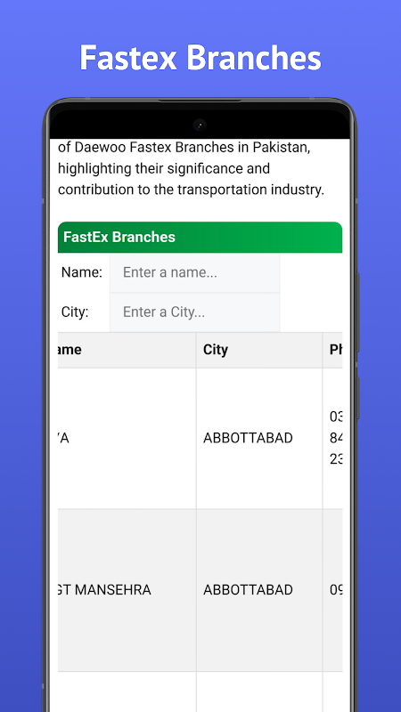 De app "Daewoo FastEx Tracking" is uw ultieme oplossing voor het gemakkelijk en gemakkelijk volgen van pakketten en zendingen. Als betrouwbaar en efficiënt koeriers- en vrachtbedrijf dat actief is in Pakistan, zorgt Daewoo FastEx voor naadloze bezorgdiensten voor al uw pakketten door het hele land. Met de app "Daewoo FastEx Tracking" kunnen gebruikers op een probleemloze en efficiënte manier de status en locatie van hun zendingen in realtime volgen.