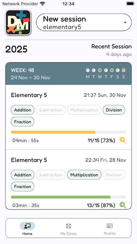 - Bekijk de opgeloste opgaven per sessie