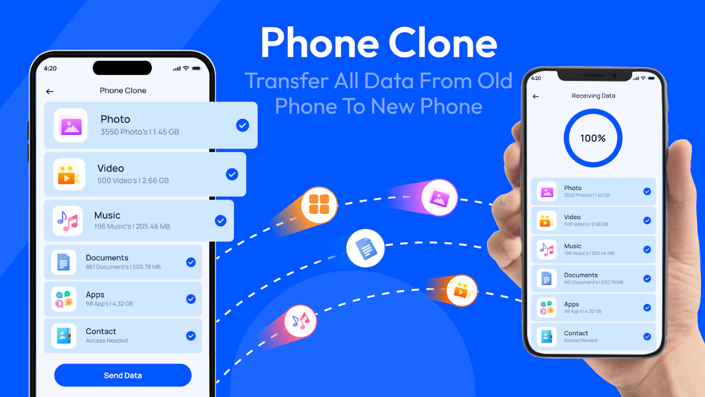 Phone Clone Data Transfer staat voor u klaar! Met krachtige functies zoals inhoudsoverdracht, slimme schakelaar en telefoonkloon kunt u met deze app voor bestandsdeling al uw gegevens, van foto's en video's tot contacten en bestanden, veilig en beveiligd overzetten. Of het nu gaat om gegevensoverdracht van telefoon naar telefoon of het kopiëren van mijn gegevens, Smart Transfer biedt een snelle en eenvoudige manier om inhoud over te zetten tussen smartphones, waaronder Android en iPhone, via Move to iOS.