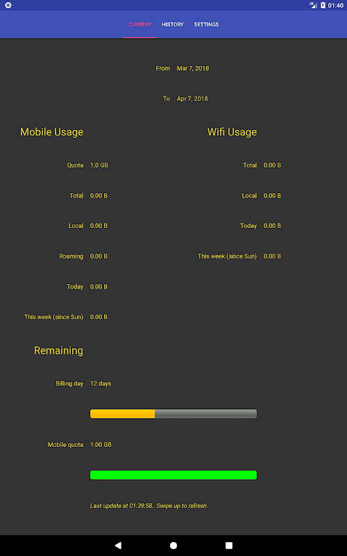 On second page, you can review usage history on daily, weekly or monthly basis.