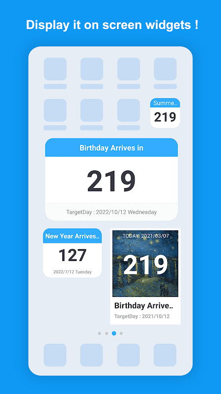 Toont het aantal dagen vanaf de grote dagen op uw scherm, zoals verjaardag, liefdesjubileum, betaaldag, zodat u de grote dagen niet hoeft te missen!
