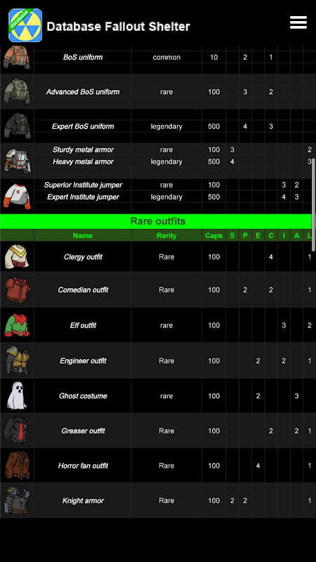 This Fallout Shelter database provides basic information about in-game Quests, Objectives, Dwellers, Outfits, Weapons, Junk Items, Pets and Creatures.