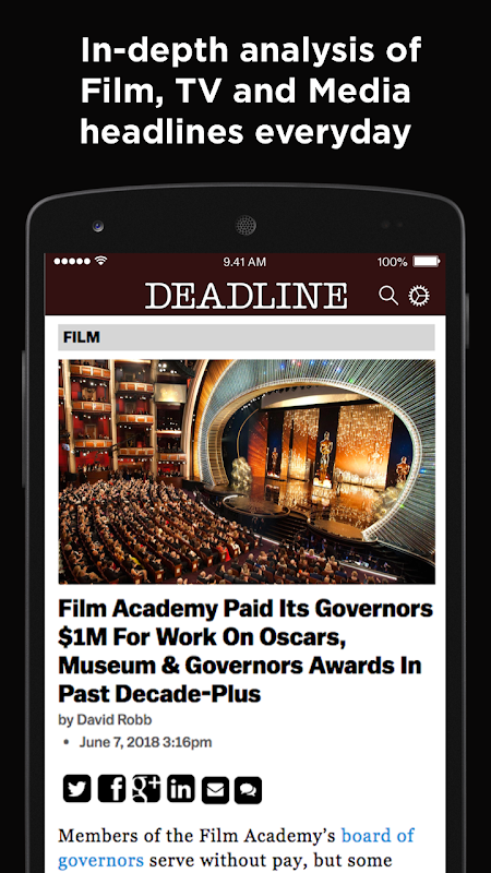 Deadline.com is one of the world's most trusted entertainment news sites. This app gives users easy access to breaking news and stories on all aspects of the industry including film, television, awards, festivals, box office, finance and media.