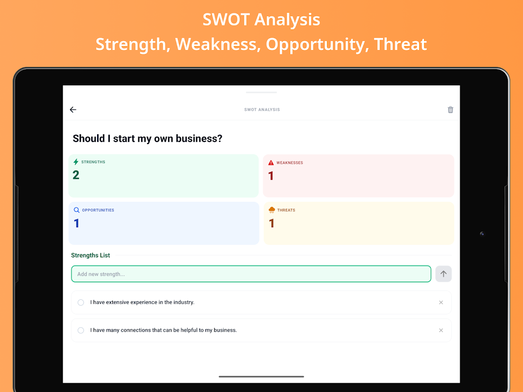 Dit is een binaire beslissingstool waarmee je positieve en negatieve argumenten kunt toevoegen. Elk argument heeft een aanpasbaar gewicht en de app berekent een nettoscore om een "Ja" (Blauw), "Nee" (Rood) of "Onbeslist" (Oranje) oordeel te bepalen.