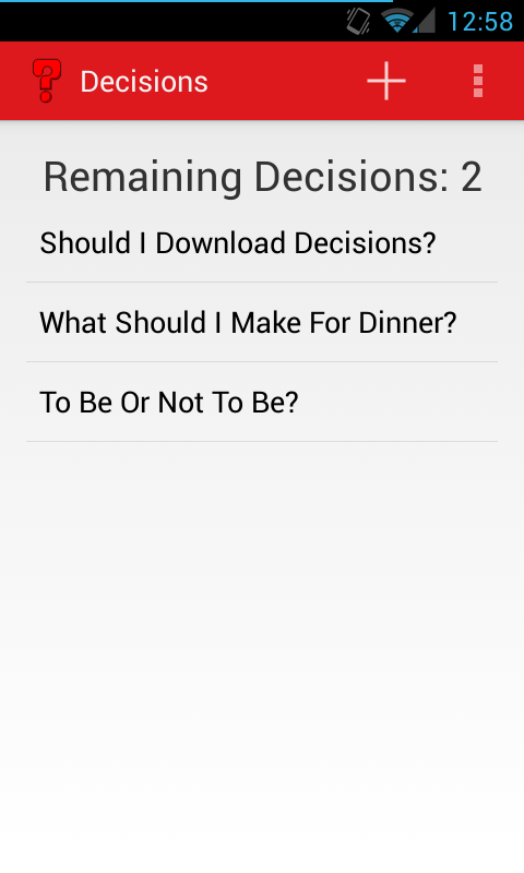 Are you indecisive? And, have trouble making decisions? Do you often ask for someone else's opinion on what you should do when you need to decide something? Decisions was created just for this. It is a customizable, easy to use, and lightweight app that allows you to answer your questions with the help of your phone!