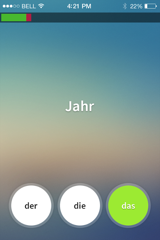 The app runs on simple grammar rule of German language. Like English language, there are three types of articles in German language but unlike English language, articles are used depending on the gender of noun. Three categories of nouns are found in German language and these are masculine, feminine, and neutral. According to grammar of German language, for masculine nouns article "der", for feminine nouns "die" and for neutral nouns "das" is used.