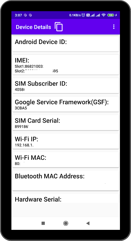 Toont apparaat-ID, SSI, SIM-kaart serieel, IMEI, Wi-Fi IP/MAC, BT IP/MAC, HW serieel