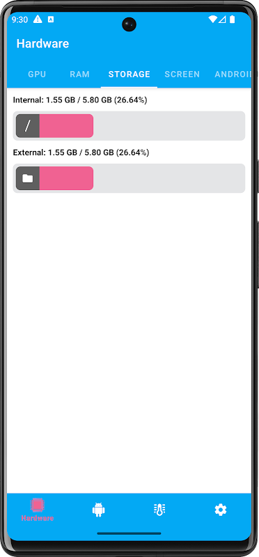 😎 Opslag: bekijk hoeveel interne en externe opslag uw apparaat heeft en hoeveel beschikbaar is voor gebruik.