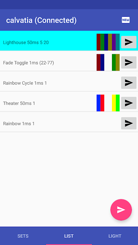 In the “list” tab pressing on the floating action button on the bottom right will send the whole set to the light. Pressing on the “send” button next to a light configuration will send only this one configuration to the light. Pressing somewhere else on the light configuration will navigate us to the “light” tab where the light configuration details will be shown.