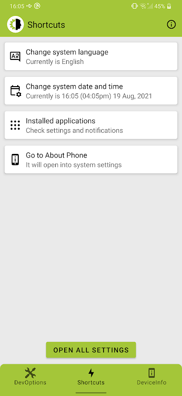 Daarnaast zijn er snelkoppelingen om de hoofdinstellingen van het apparaat te bereiken en wat informatie over uw apparaat die u zullen helpen bij het ontwikkelen van uw applicatie.