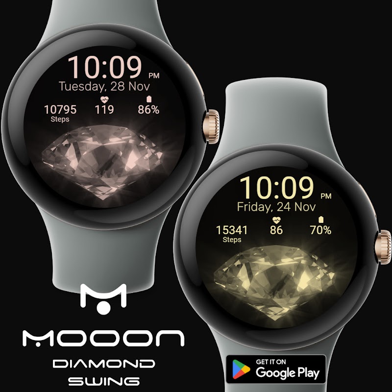 Bekijk het gezicht met een animatie van een glinsterende diamant in 11 kleuren voor Wear OS.