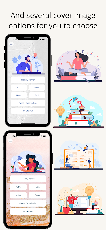 Kies uit 6 prachtige thema's, selecteer je voorkeurstaal (Engels, Portugees of Spaans) en stel je tijdsindeling in (12 uur of 24 uur). Maak je dagboek echt van jou.