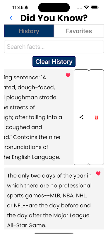Fuel your curiosity with daily and random facts that surprise, entertain, and educate! Whether you're a trivia lover, lifelong learner, or just like to impress your friends, Did You Know? delivers bite-sized knowledge right to your fingertips.