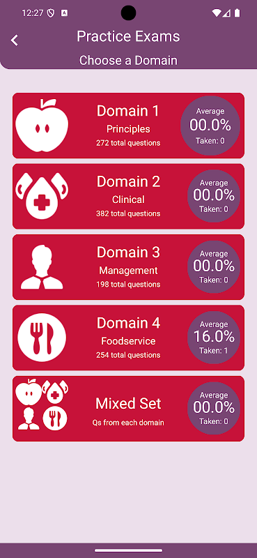 De vraaginhoud is onderverdeeld in de 4 hoofddomeinen van het RD-examen. Kies een van de vier domeinen om te oefenen, waarna u het aantal vragen kunt kiezen dat u vanuit het domein wilt stellen. Kies uit 10, 25, 50, 100 of alle vragen in het domein. U kunt ook de optie Gemengde set-test kiezen en er vervolgens voor kiezen om een willekeurige test van 25, 50, 100 of een volledig examen van in totaal 145 vragen uit elk domein af te leggen.