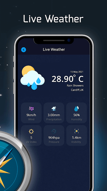 Digital Compass - GPS & Map app provides Live weather feature, which shows you current direction of Wind, Humidity, Pressure, Sunrise and Sunset time.