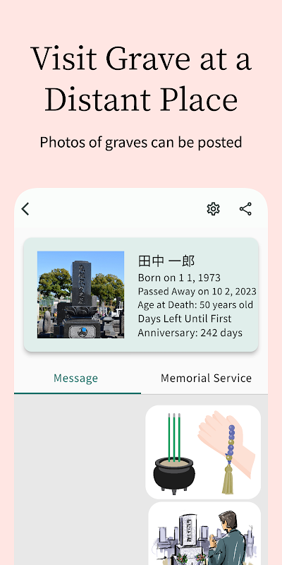 (Geplande extra functie) U kunt herinneringen achterlaten zonder beperkt te worden door het aantal tekens dat op een grafsteen is gegraveerd. U kunt foto's en verhalen over de overledene delen, wat een meer ontroerende ervaring biedt voor degenen die hun respect betuigen.